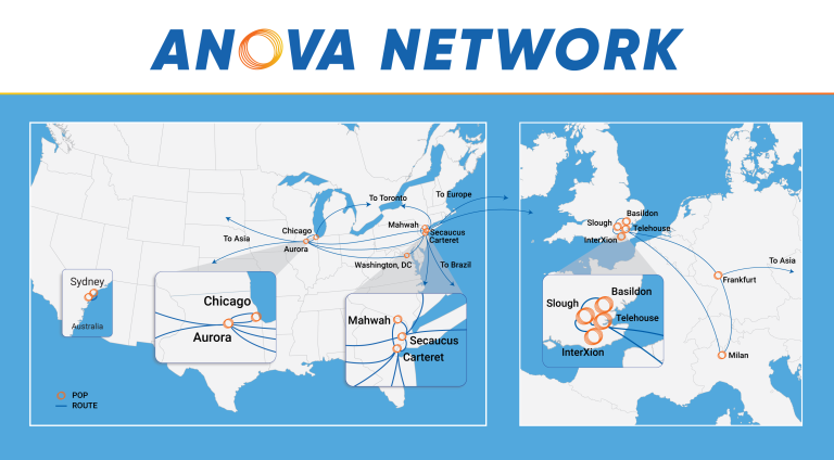 Anova’s extensive fiber network map covers major financial exchanges, metro networks and longhaul routes in key financial markets across North America, Europe and Asia. Our New Jersey Equity Triangle—connecting Mahwah, Secaucus, and Carteret—offers the shortest paths, fastest routes and highest capacity (up to 100 Gbps) for optimal trading performance between the U.S., Canada and Europe.